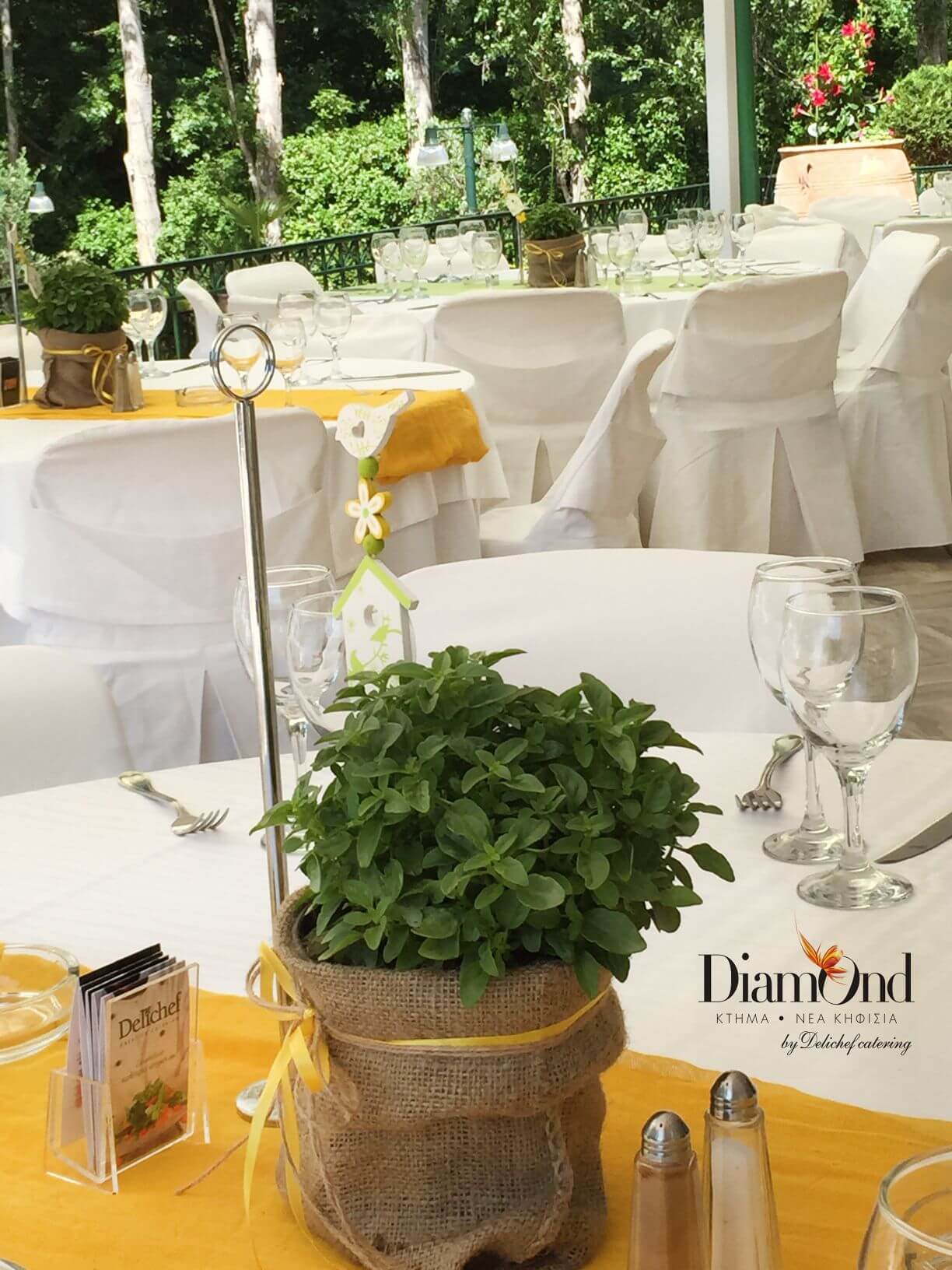 Το Κτήμα DIAMOND by Catering Delichef, είναι η ιδανική επιλογή για την εκδήλωση της βάπτισής σας. Βρίσκετε σε στρατηγική θέση πολύ κοντά στην Εθνική οδό στην Νέα Κηφισιά, σε μια καταπράσινη έκταση ακριβώς δίπλα στις όχθες του ρέματος της Χελιδονούς. Υπέροχος αλλά και ρομαντικός χώρος με πλούσια βλάστηση και αέρα εξοχής. Ο χώρος αποπνέει την “country chic” αίσθηση της εξοχής με πολλά στοιχεία vintage. Μαζί θα οργανώσουμε την βάπτιση σας.